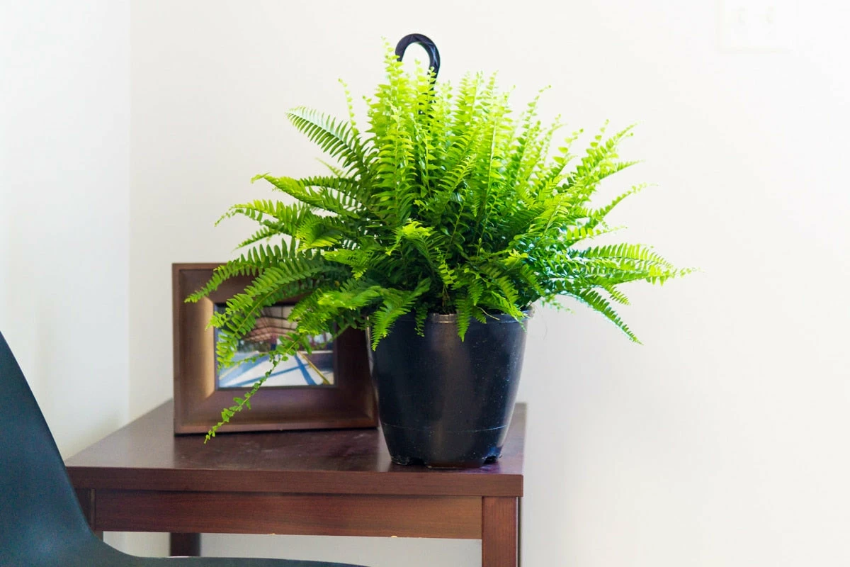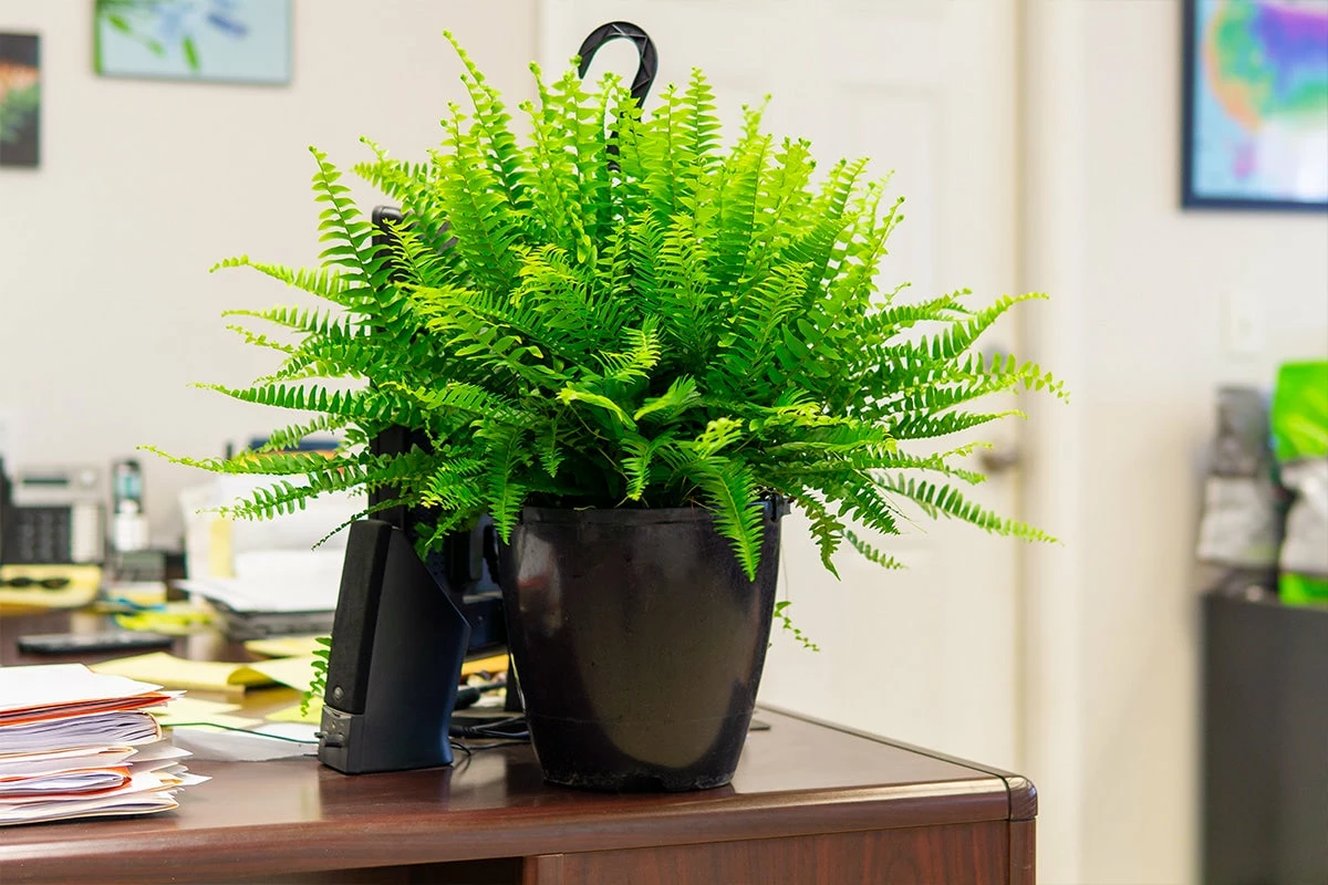The Boston Fern plant comes in a hanging pot that can be hung up on patios or back porches, indoors in a sunroom, bedroom, or bright office. It is one of the top related plants to reducing air pollutants in the home.