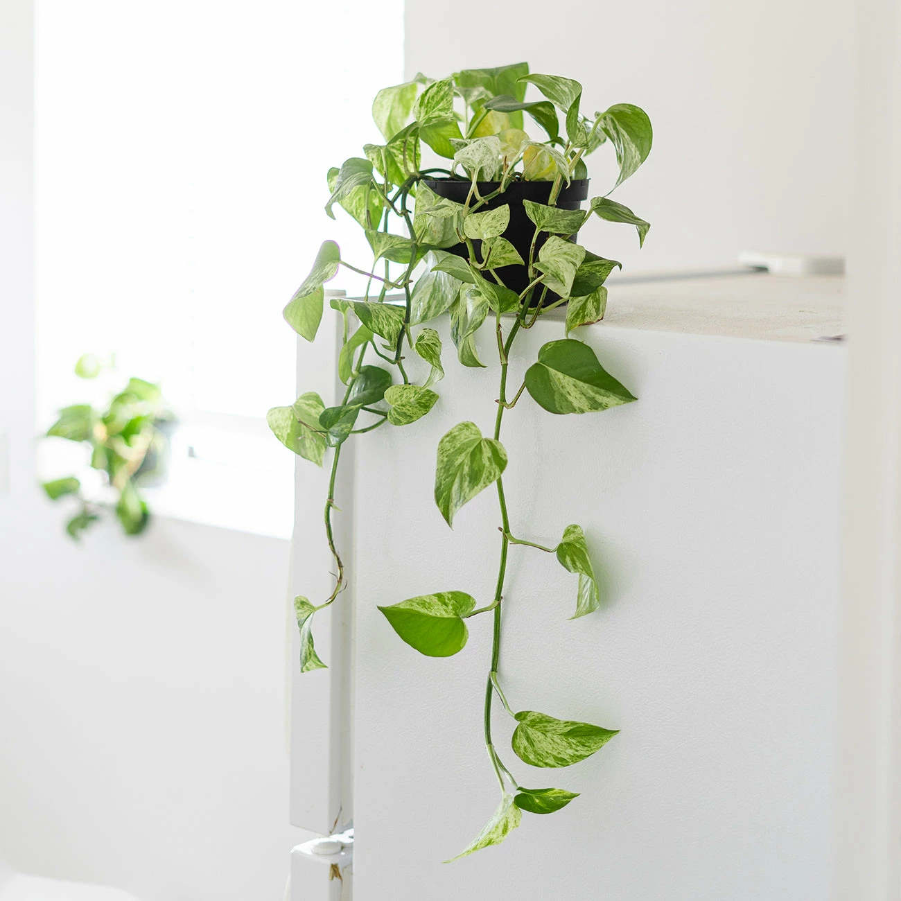 This houseplant, Epipremnum aureum ‘Marble Queen’, is native to French Polynesia but has become a common ornamental plant because of its low maintenance characteristics and unique appearance. The growth habit options are endless! Wrap the long vining stems around a pot, or pot them in a hanging basket for a draping effect. You can even train the indoor plant to grow on a vertical wall and watch it spread like ground cover. Pothos varieties come in all shapes and sizes