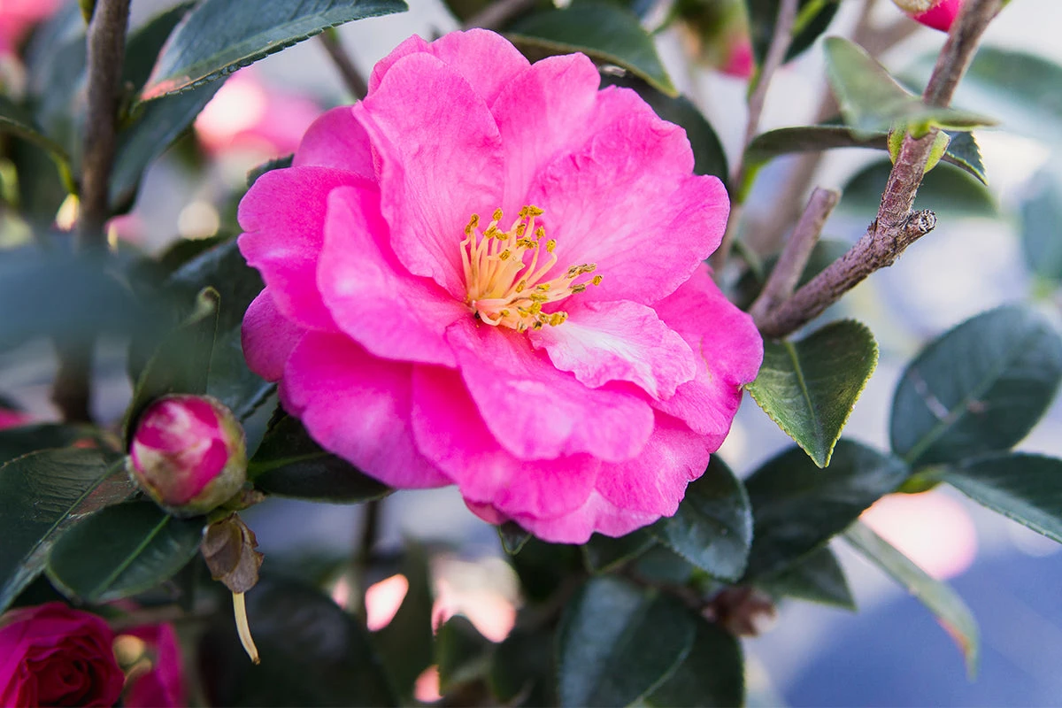 The dwarf Camellia sasanqua ‘Shishi Gashira’ looks amazing planted as an evergreen shrub hedge, small specimen tree, or in a woodland garden along a wall or fence where the dark pink double flowers can be enjoyed.