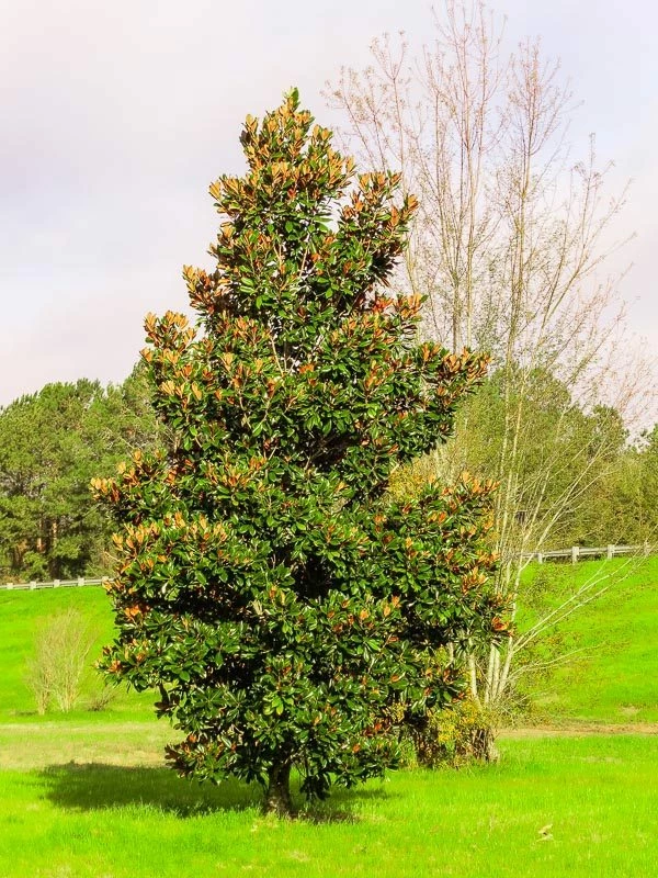 The D.D. Blanchard will maintain an upright pyramidal-oval form. It is an evergreen tree with leathery, textured oblong leaves that feature a glossy, dark green appearance on top with a rusty-brown underside. This gives it a two tone appearance from further away that is simply remarkable.