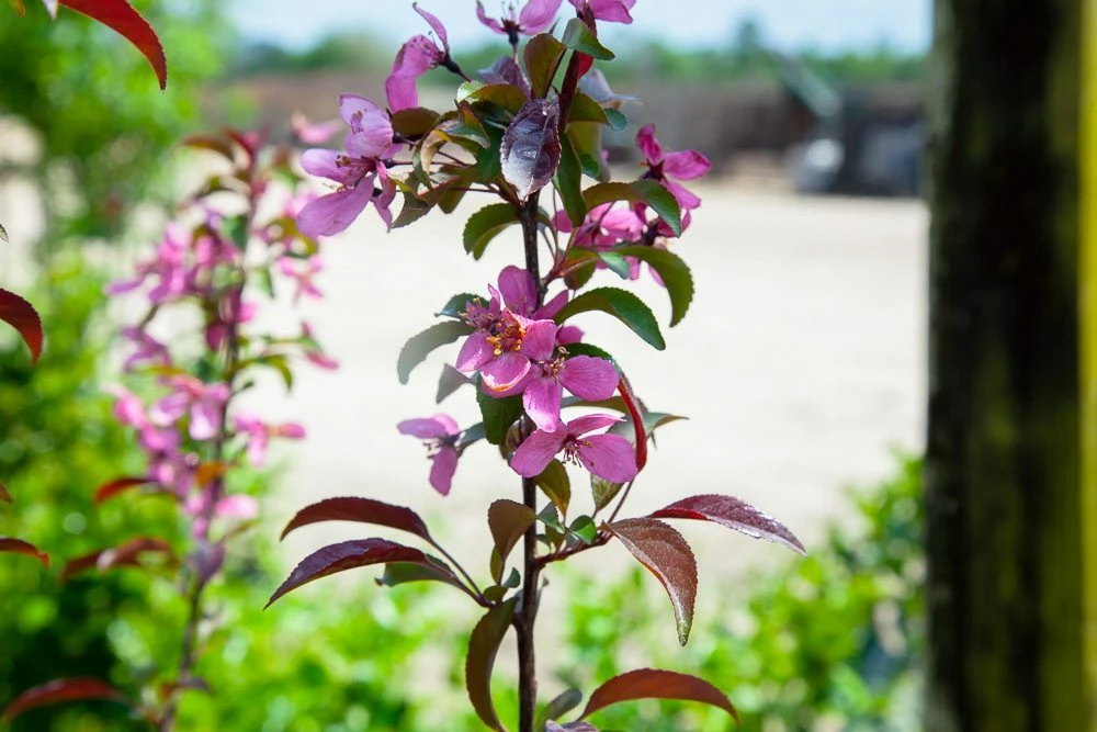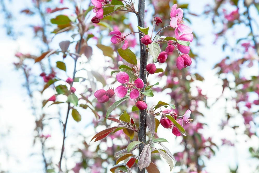 Crabapple tree flower color is dependent on the variety and this ornamental tree has bright pink almost purple blooms. The pink flowers appear in early spring and bright red fruit appears in the summer months which makes it an excellent statement piece. The fruit is less than 2 inches in diameter and can be spiced or used in jelly.