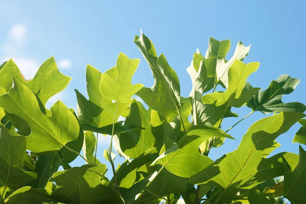 The Tulip poplar tree actually is not a poplar at all but is a member of the magnolia family. The tulip poplar leaves are tulip-shaped and simple. The yellow poplar leaf is smooth on both surfaces, dark green and lustrous above, and often pale with a slight whitish bloom beneath.