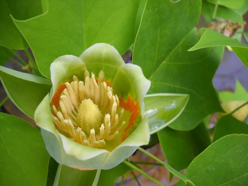 This beautiful tree is covered in light, greenish-yellow tulip shaped flowers with an orange band from April to June in the summer months. The tulip poplar flower puts on a gorgeous display during the spring and summer blooming season.