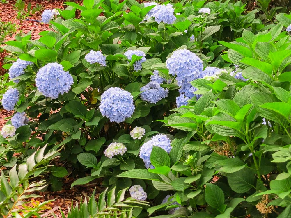 Mini penny hydrangeas tend to have blue flowers in acidic soils and pink flowers in more alkaline soils depending on the soil pH. The dark green leaves will stay on the shrub until the first frost and contrast the blooming mophead flowers nicely.