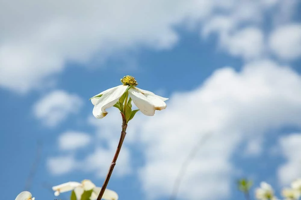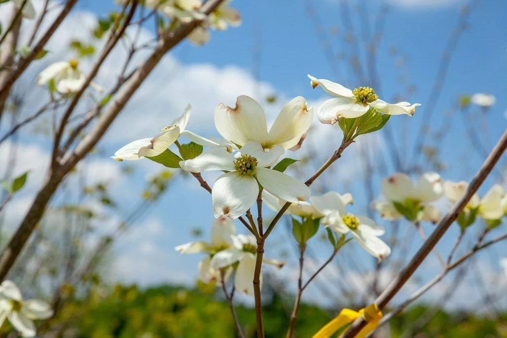 Since the White flowering Dogwood tree is a small deciduous tree, it will begin the year leafless during late winter. Early spring brings white dogwood blossoms that are tiny, yellowish green and shaped as dainty button-like clusters. Each Cornus Kousa Dogwood flower cluster has four showy, white, petal-like leaves which open flat. This gives the appearance of a single, four-petaled, white bract.